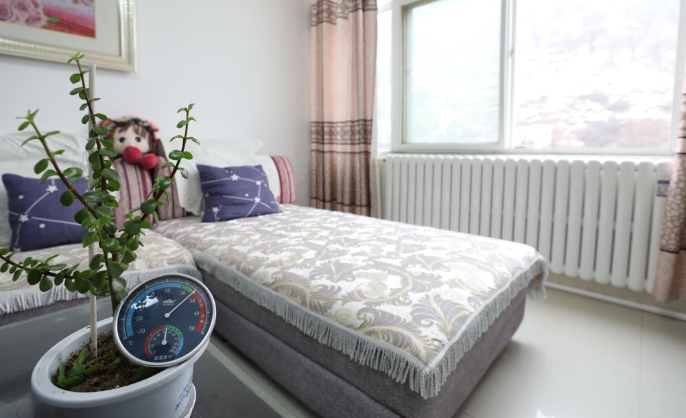 供暖管道開通后,平房二樓的三居室內,擺在玄關上的溫度計顯示為25攝氏度,擺放在臥室、客廳的花草綠植競相斗艷,窗外不遠處的黃土坡上,積雪漫山。