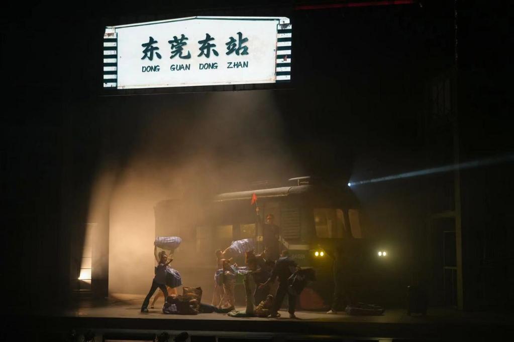 “故事開始,飛馳的年代……軌道不斷變換,無人可以離開?!卑殡S著陣陣歌聲,舞臺上,“東莞東”大大的火車站牌下,人潮人海。