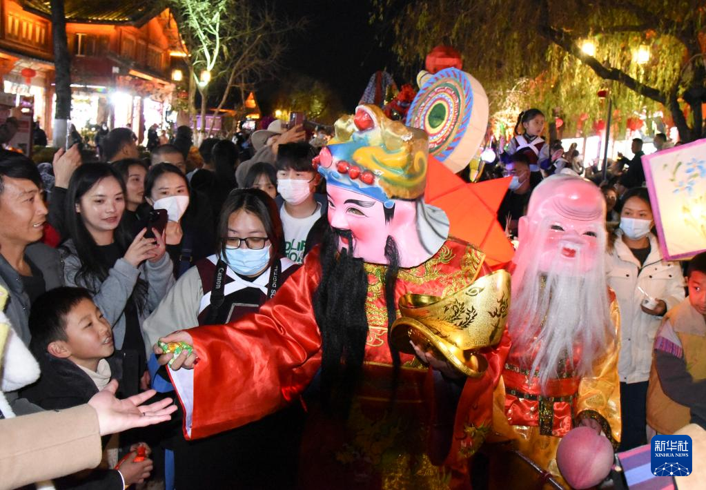 2月5日,在云南省麗江古城的元宵提燈會上,“財神爺”在給游客發糖。
