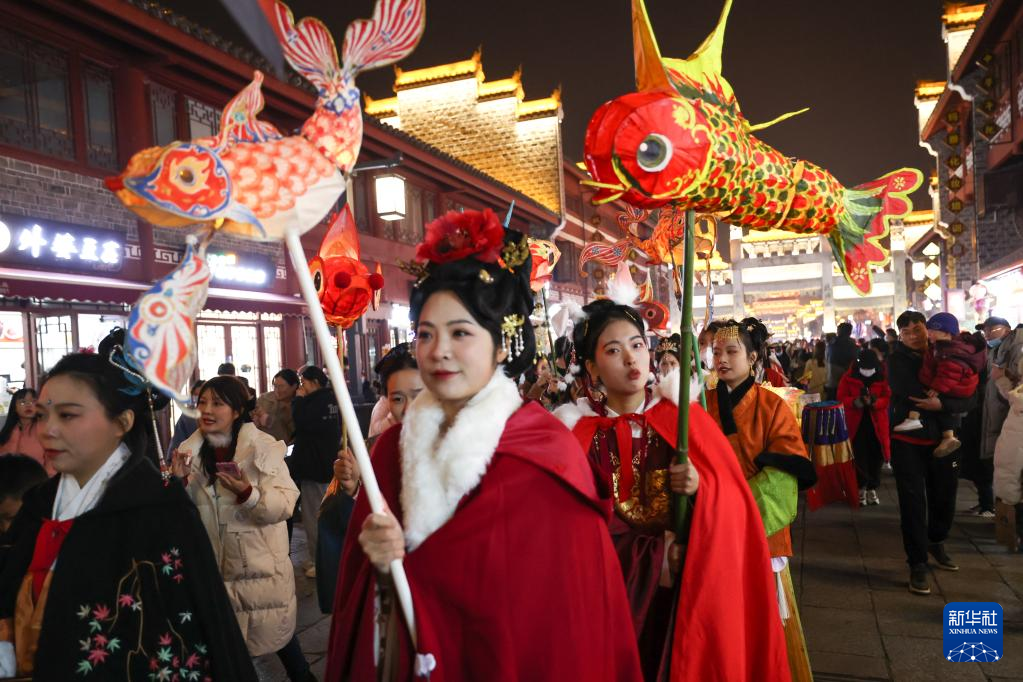 2月5日,在湖北襄陽古城元宵廟會上,人們舞魚燈、游古城。