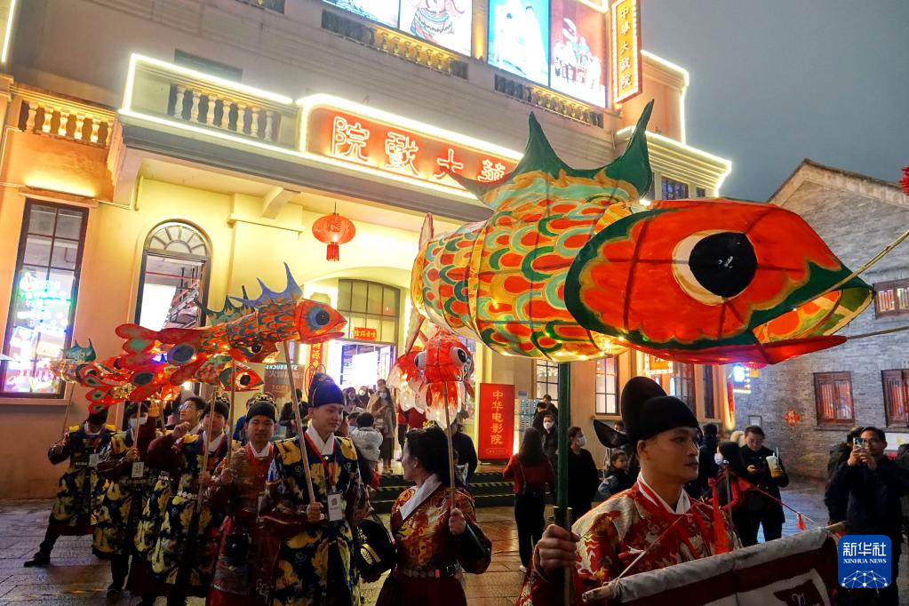 2月5日,在廣西南寧市三街兩巷歷史文化街區,人們手持鯉魚花燈巡游。