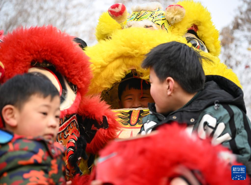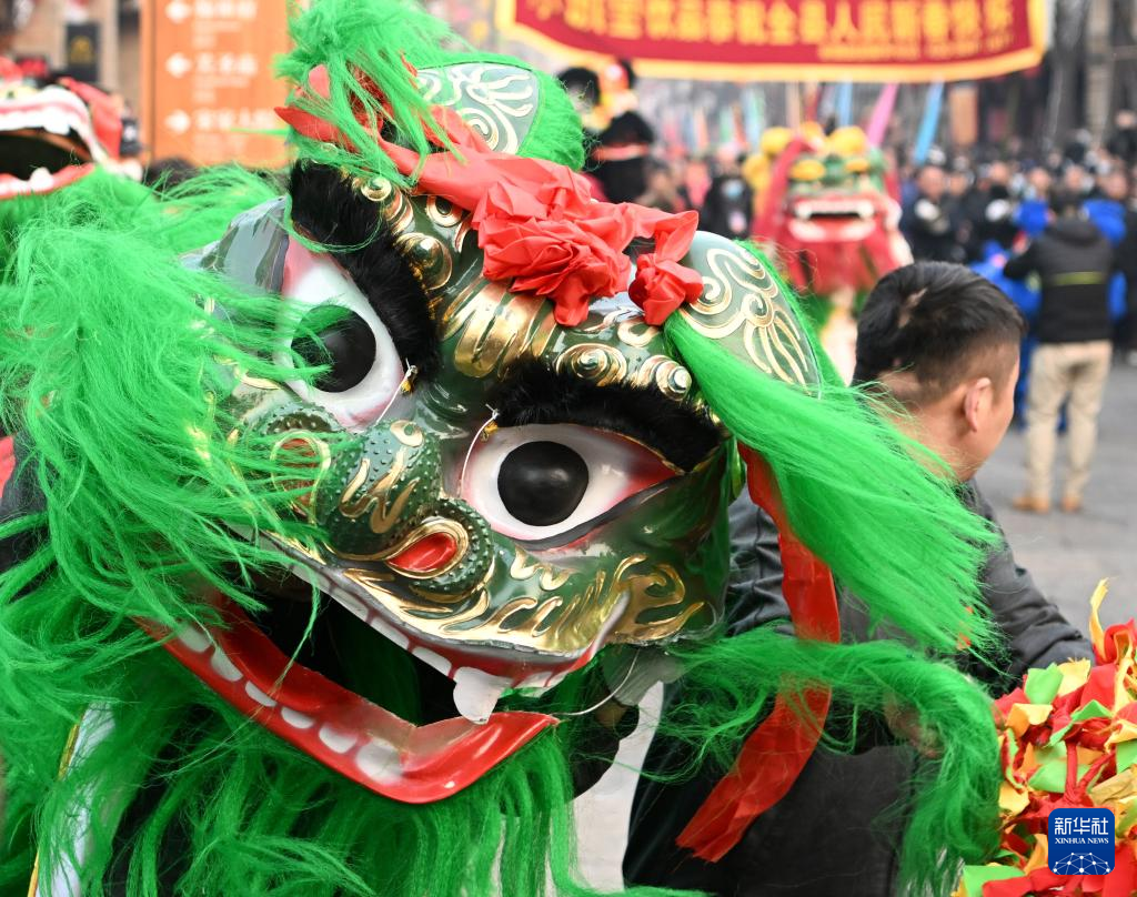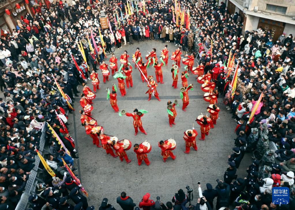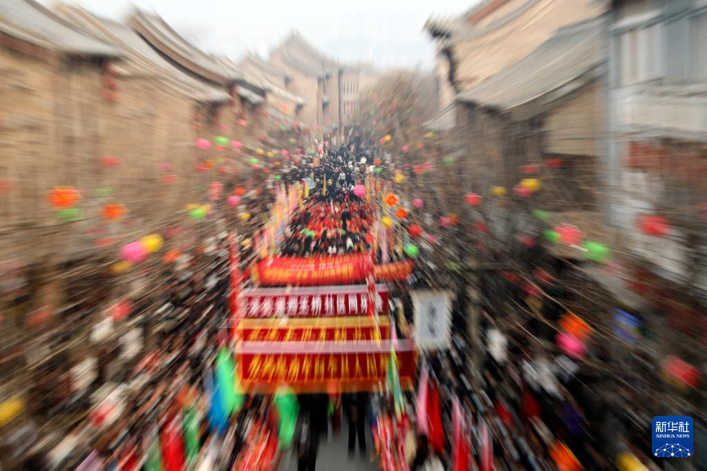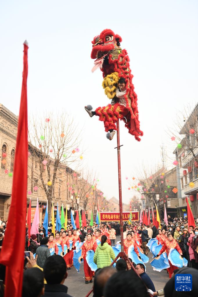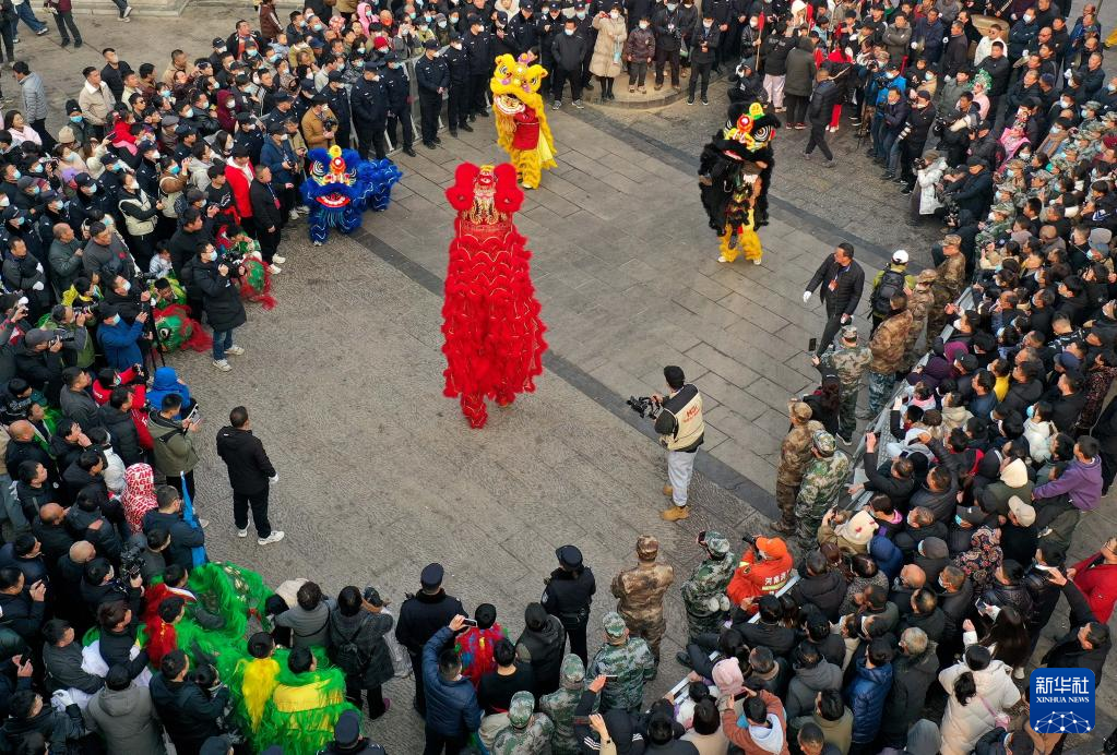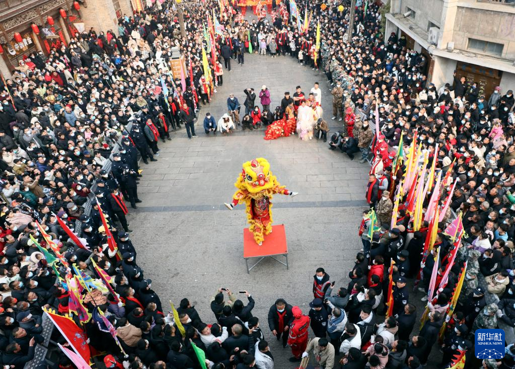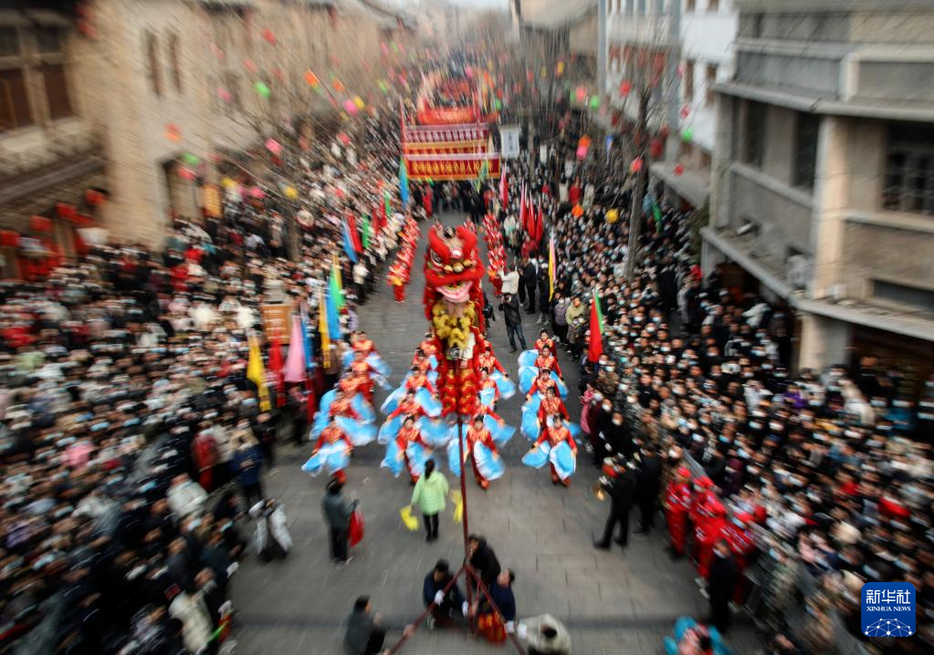 2月6日,社火團隊的演員在廟會上表演舞獅(無人機照片)。