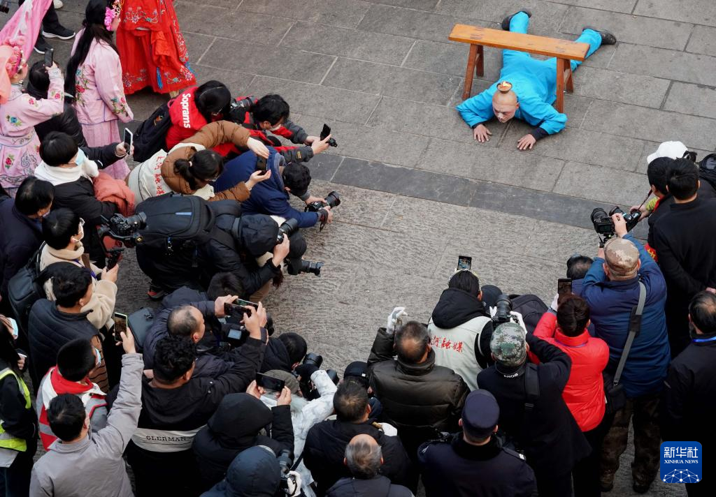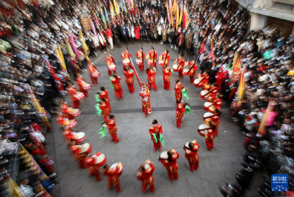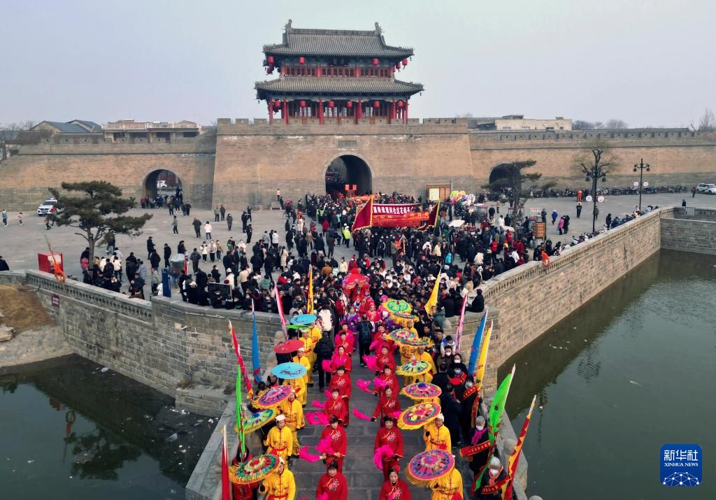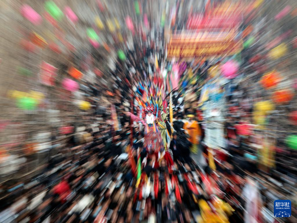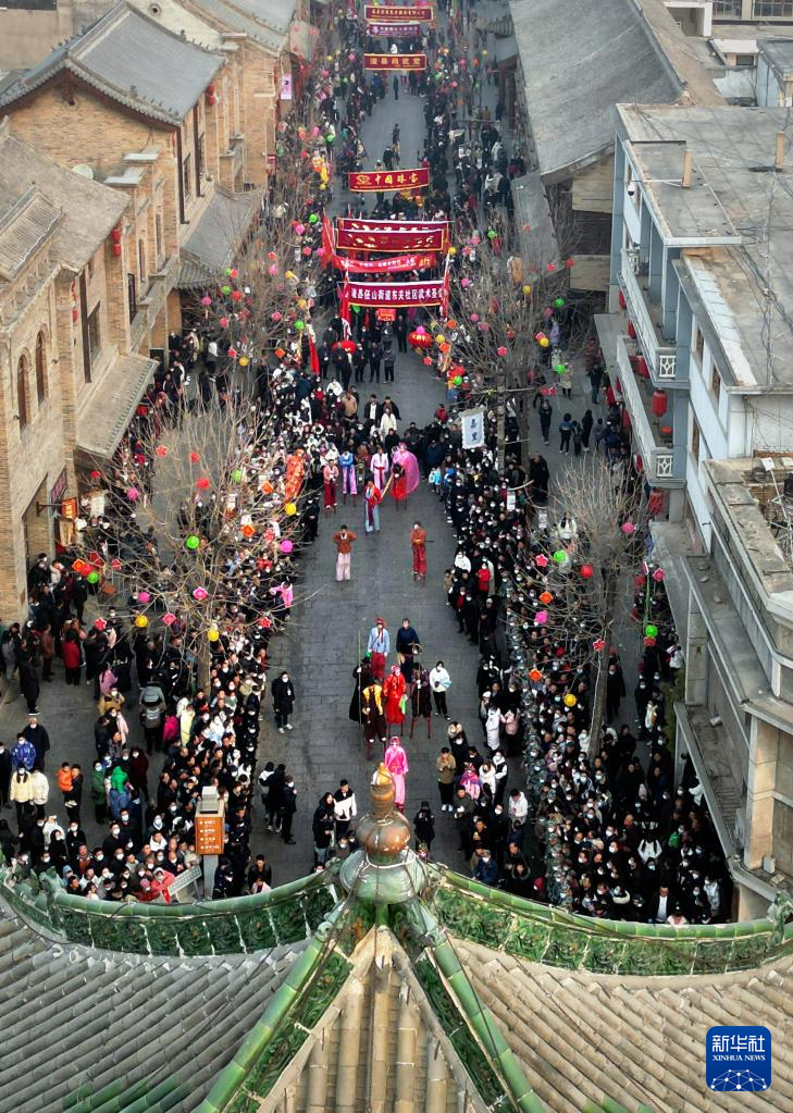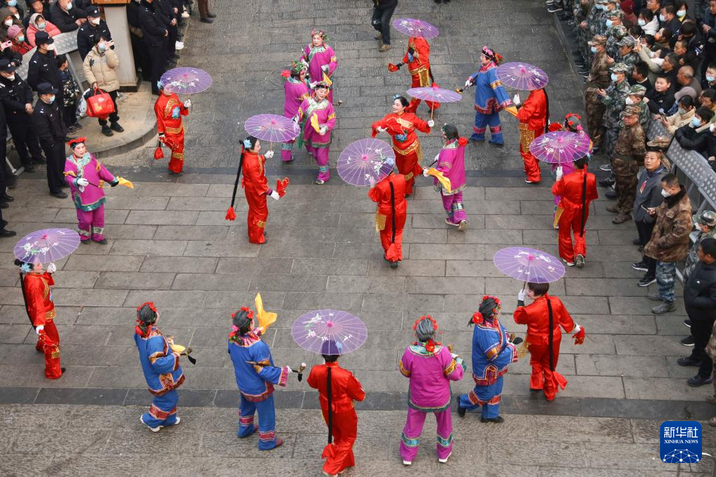 2月6日,社火團隊的演員在廟會上表演(無人機照片)。