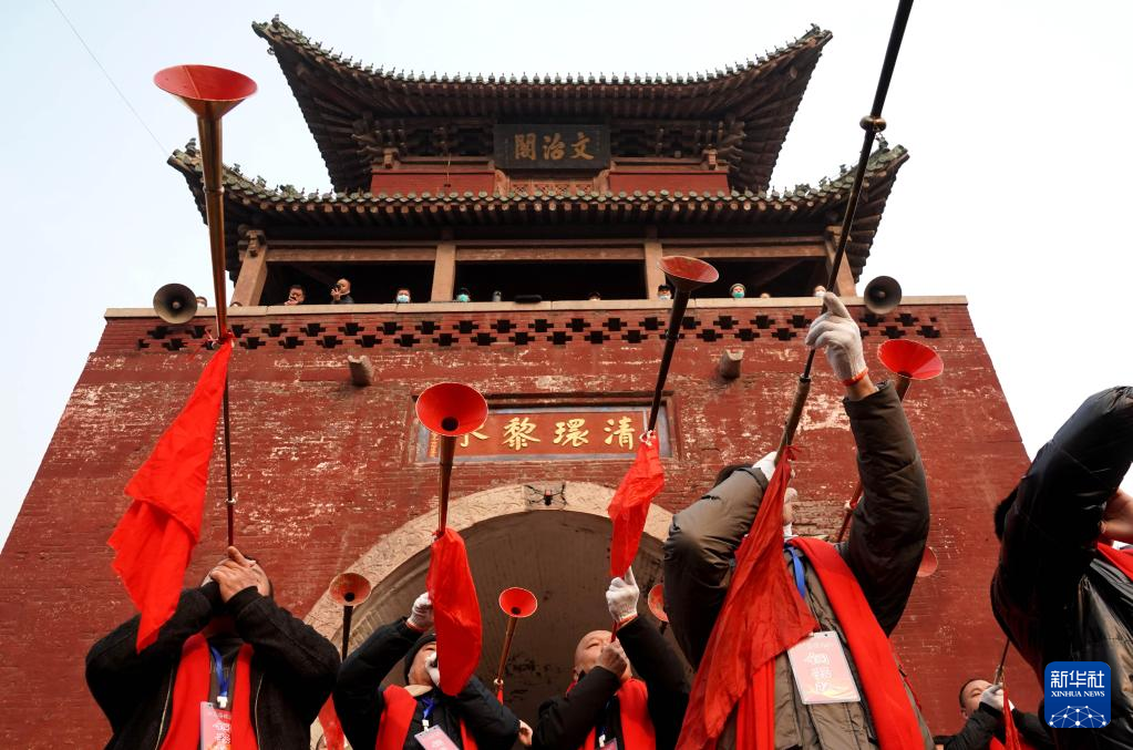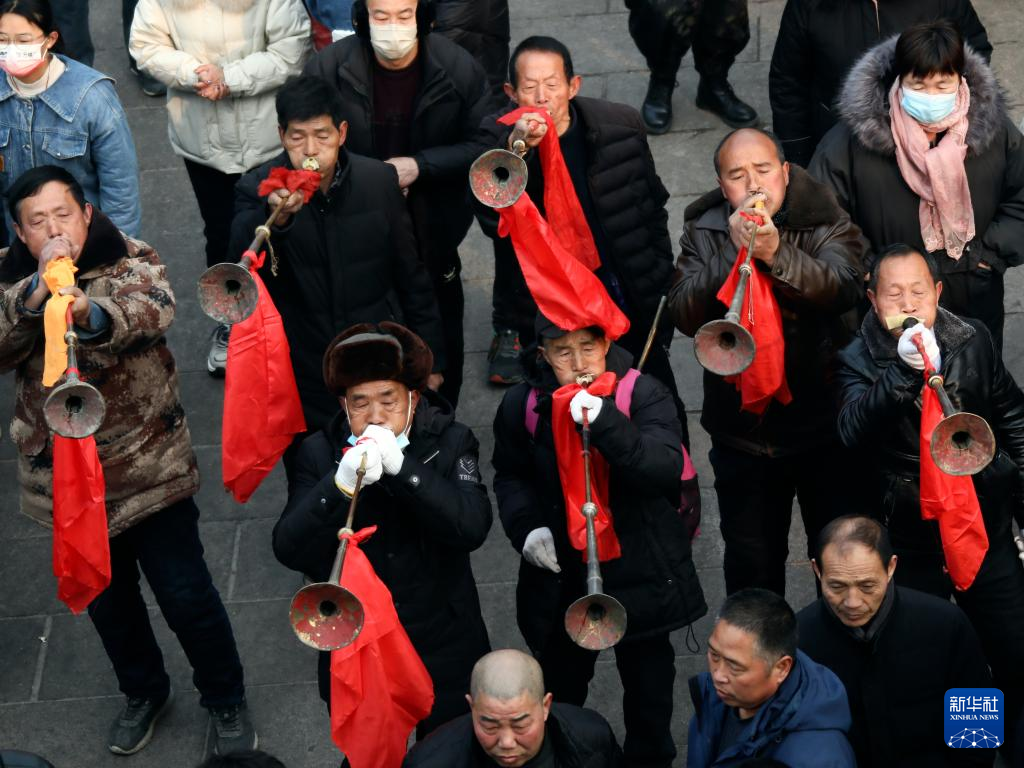 2月6日,社火團隊的成員在廟會上奏樂。