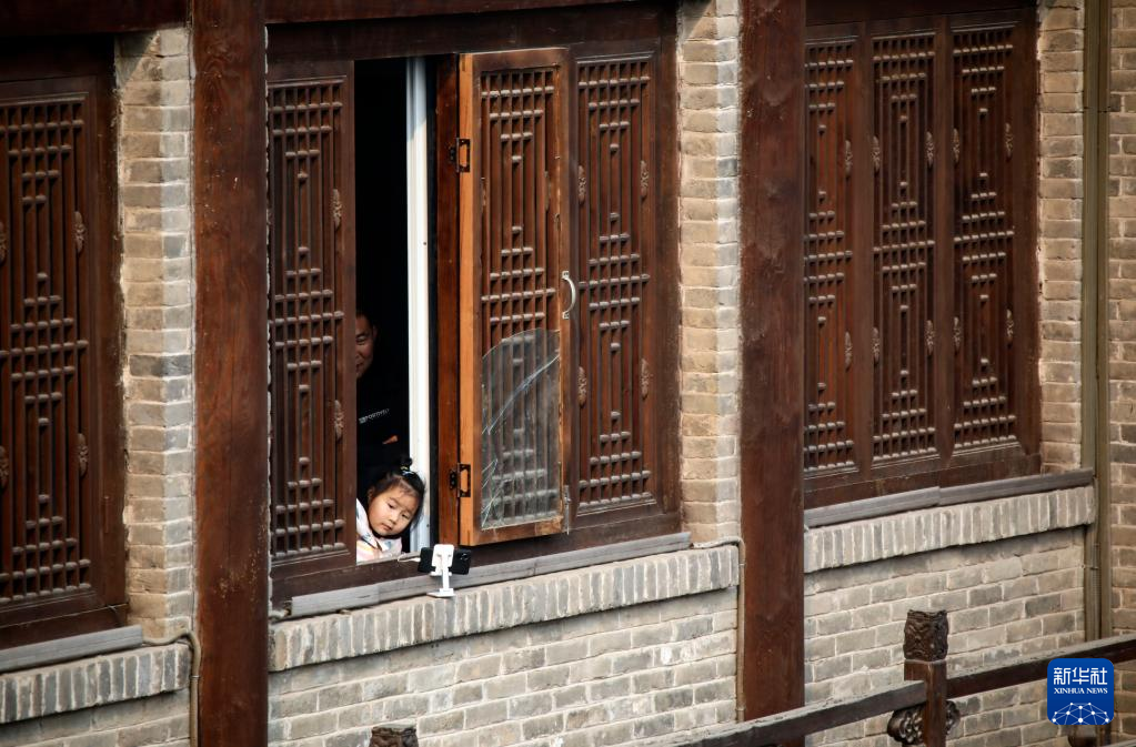 2月6日,小朋友在窗邊觀看廟會表演。