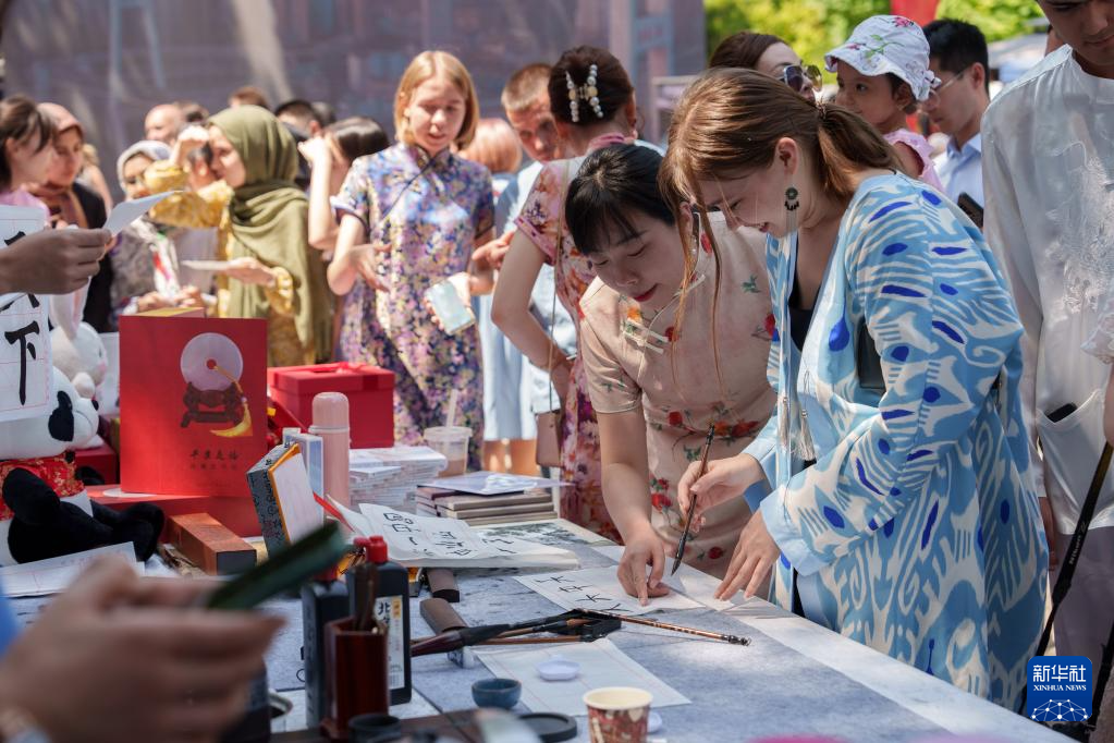 5月27日,人們在烏茲別克斯坦首都塔什干的中央公園體驗中國書法。新華社發(格奧爾吉·納馬佐夫攝)