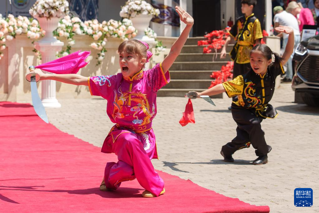 5月27日,小演員在烏茲別克斯坦首都塔什干的中央公園表演武術。