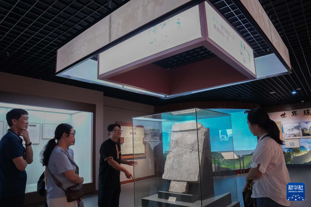 8月25日,在位于廣西金秀的瑤族博物館,館長盤威(右二)向游客介紹《大瑤山團結公約》石碑。