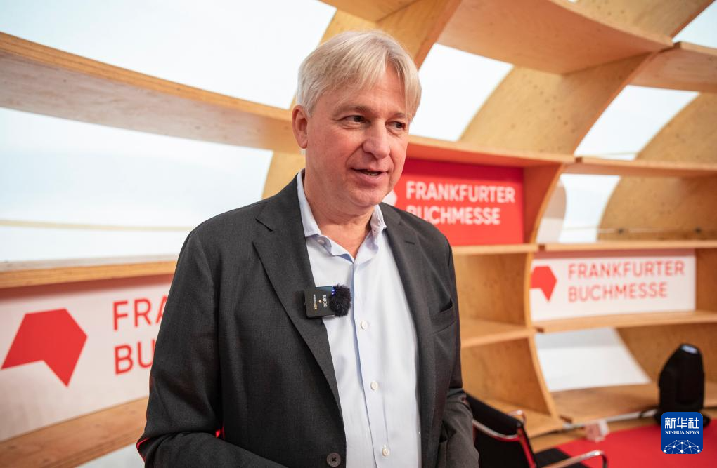 10月15日,法蘭克福書展主席于爾根·博斯在德國法蘭克福書展開幕式活動上接受采訪。