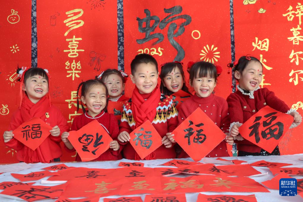 1月13日,在山東省高密市金蘋果幼兒園新春游園活動現場,孩子們在曬福字。