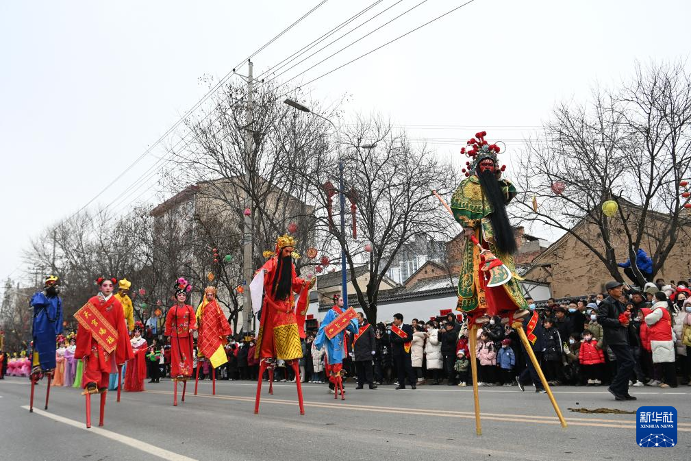 2月12日,高蹺社火演員在隴縣元宵節社火巡游活動上表演。