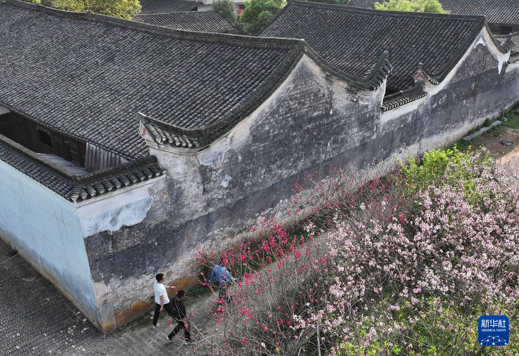 3月25日,村民在周家大院“子巖府”外桃園里散步。