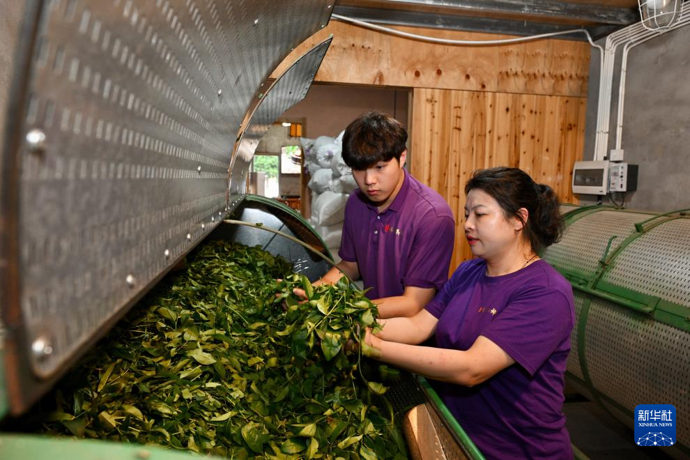 5月7日,工人們在武夷山陶淵明有機茶廠晾曬茶青。