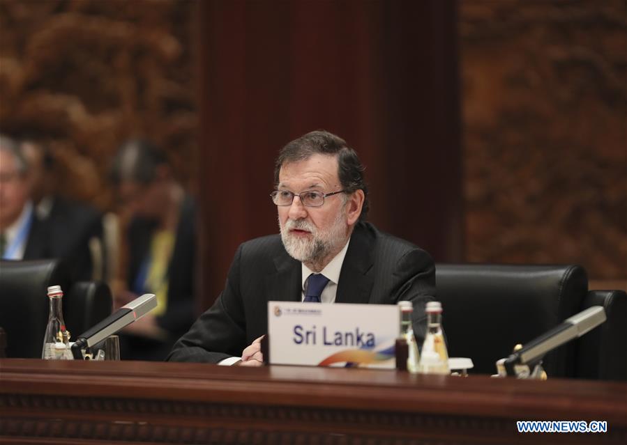Spanish Prime Minister Mariano Rajoy speaks at the Leaders' Roundtable Summit of the Belt and Road Forum (BRF) for International Cooperation at Yanqi Lake International Convention Center in Beijing, capital of China, May 15, 2017. (Xinhua/Lan Hongguang)