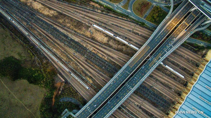 Photo taken on Feb. 5, 2016 shows bullet trains running in and out of the Shenzhen North Railway Station in Shenzhen, south China's Guangdong Province. The Hong Kong section of the Guangzhou-Shenzhen-Hong Kong Express Rail Link is expected to be completed in 2018. From Guangdong to Hong Kong and Macao, can people work in one city and sleep in another? With the help of infrastructure connectivity, it becomes achievable to establish a "one-hour circle" within the Greater Bay Area in the near future. The Guangdong-Hong Kong-Macao Greater Bay Area, as a city cluster involving overall population of 66 million in south China, encompasses Hong Kong, Macao and nine cities in Guangdong Province. Many major infrastructure projects will help turn the bay area into a more dynamic economic zone that is suitable for living, doing business and travelling. The Guangzhou-Shenzhen-Hong Kong Express Rail Link will connect Hong Kong to the renowned high-speed rail network of China via a 26-km tunnel. After the project is completed next year, the travel time from Hong Kong to Guangzhou, capital city of the bordering Guangdong Province, will be shortened from two hours to only 48 minutes. The Hong Kong-Zhuhai-Macao bridge, the world's longest manmade sea crossing, consists of a 22.9-km bridge and 6.7-km underground tunnel that spans the width of the Pearl River Delta. The Y-shaped bridge will cut travel time between Hong Kong and Zhuhai from three hours to just 30 minutes. With expanding capacities of roads, railways and ports, the Greater Bay Area will see a highly convenient and efficient transportation network. (Xinhua/Mao Siqian)