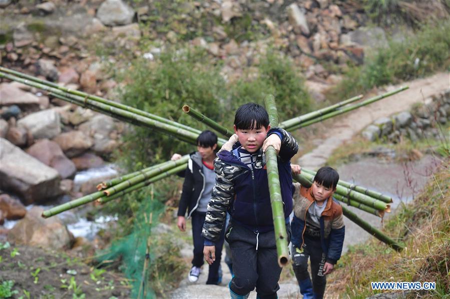 The 12-year-old Bu Guibing (C) carries bamboos on his shoulders in Wuying Village of Miao ethnic group in Rongshui County, south China's Guangxi Zhuang Autonomous Region, Jan. 14, 2018. Local people were busy making lusheng to greet the New Year festival of Miao ethnic group. (Xinhua/Huang Xiaobang)