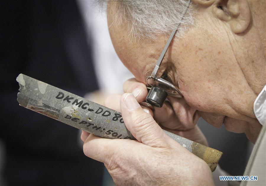 A participant takes a closer look at a rock sample while visiting an exhibition booth during the BC Mineral Exploration Roundup Conference in Vancouver, Canada, Jan. 22, 2018. The exhibition focuses on technology and innovation in mineral exploration. (Xinhua/Liang Sen)