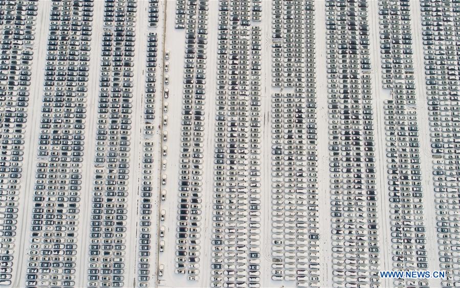 Photo taken on Jan. 28, 2018 shows new vehicles on the ground after a snowfall in Xiangyang, central China's Hubei Province, Jan. 28, 2018. (Xinhua/Wang Hu)