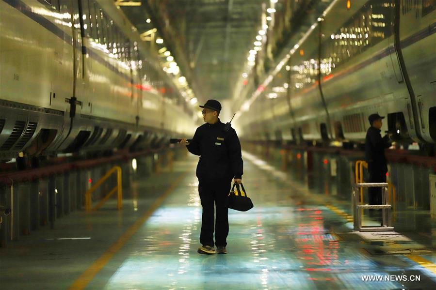 Workers check the bullet trains at a maintenance station in Guiyang, capital of southwest China's Guizhou Province, Jan. 31, 2018. Workers check the trains in order to guarantee the safety during the Spring Festival travel rush between February 1 and March 12. (Xinhua/Wu Jibin)