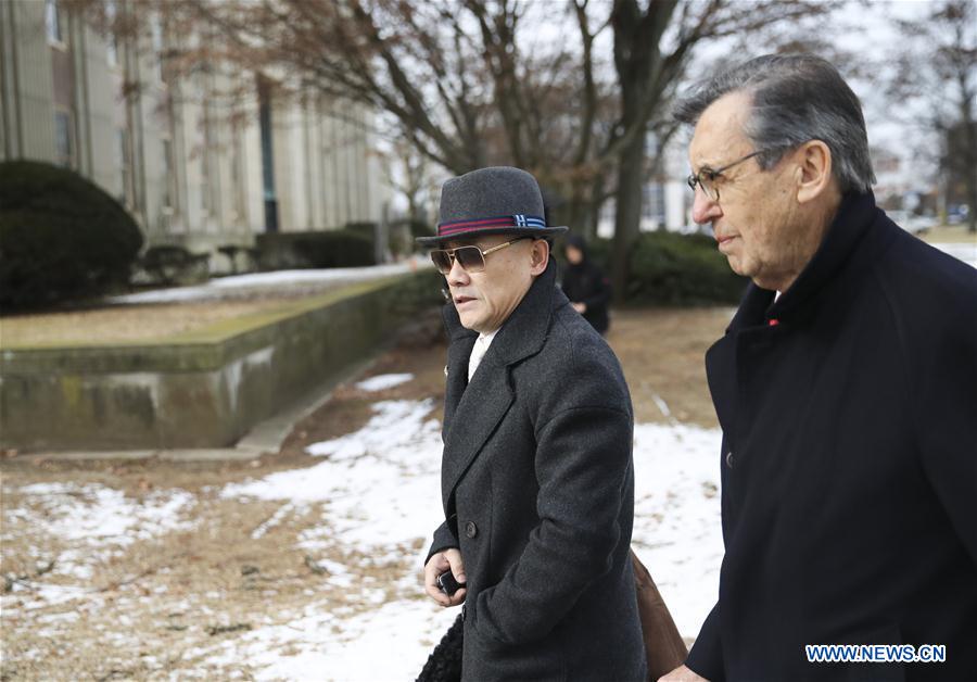 Zhou Libo (L) leaves Nassau County Court after a court session in Nassau County, New York, the United States, Feb. 1, 2018. Chinese comedian Zhou Libo appeared in a court session with the judge and prosecutor here on Thursday. Zhou is charged with illegal possession of a handgun, possession of a controlled substance identified as crystal methamphetamine and driving while using a cellphone. (Xinhua/Wang Ying)