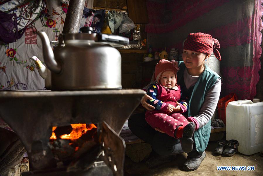 A herder holds her daughter to warm themselves by a stove at home in Akyaz Valley, Zhaosu County, northwest China's Xinjiang Uygur Autonomous Region, Jan. 15, 2018. About 130 kilometers from the nearest town, Akyaz Valley is an important winter grazing place for herders in Zhaosu County, Xinjiang. Despite an altitude of 2,000 meters, the Akyaz Valley has a warmer climate than surrounding areas and abundant grass and water. It is sometimes referred to as "the valley of life." For centuries, herding has been an ancestral tradition for nomadic Kazakhs in Zhaosu. Migration begins in October, and more than 10,000 people drive 400,000 cattle and sheep to their winter homes, not leaving until May the next year. (Xinhua/Hu Huhu)