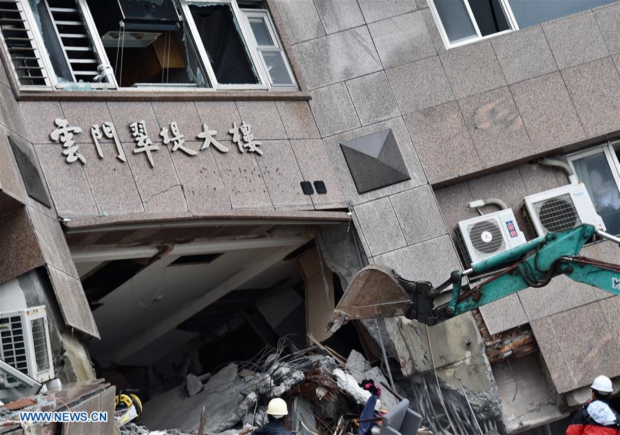 An excavator is seen at the damaged Yun Men Tusi Ti building in Hualien, southeast China's Taiwan, Feb. 8, 2018. Four tourists from the mainland had been confirmed dead as of Thursday morning after a magnitude-6.5 earthquake hit Taiwan's Hualien County. Rescuers said five other mainland tourists are still trapped in the damaged Yun Men Tusi Ti building, including four adults and one child. (Xinhua/Yue Yuewei)