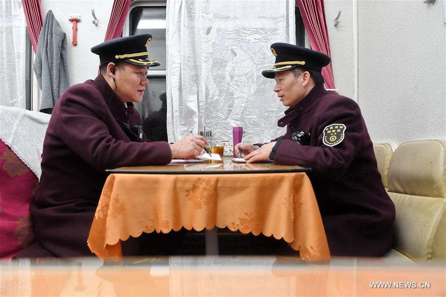 Conductor Zheng Xinqiang (R) hands over work to Chen Guang on train K46 traveling from southeast China's Fuzhou to capital city Beijing, Feb. 8, 2018. Train K46 was the first train running from southeast China's Fujian Province to Beijing when it began operation 52 years ago. A single trip of train K46 takes nearly 36 hours. (Xinhua/Lin Shanchuan)