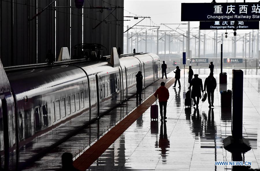 Passengers walk on the platform of Chongqing West Railway Station in Chongqing, southwest China, Feb. 12, 2018. The station witnessed the first travel peak of the Spring Festival travel rush on Monday. (Xinhua/Liu Chan)