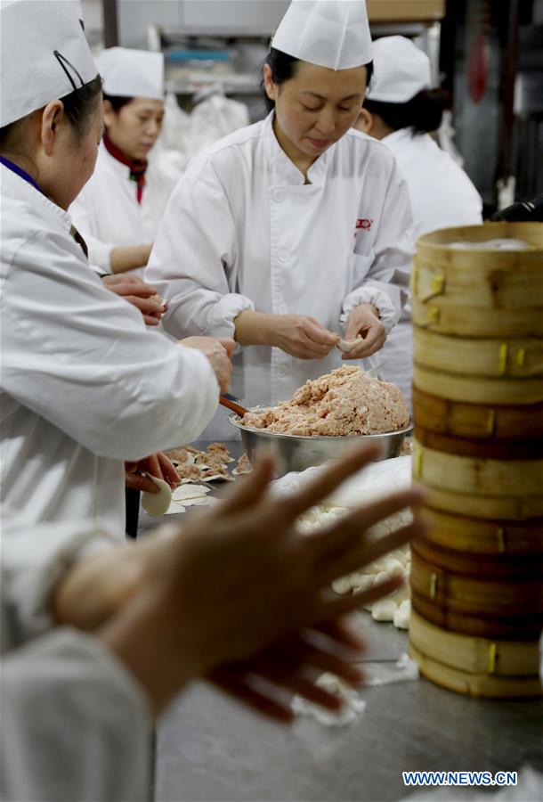 Staff members make Tangyuan, a kind of round and sweet dumpling made of glutinous rice flour, to celebrate the Lantern Festival at the Yu Garden in Shanghai, east China, March 2, 2018. (Xinhua/Liu Ying)