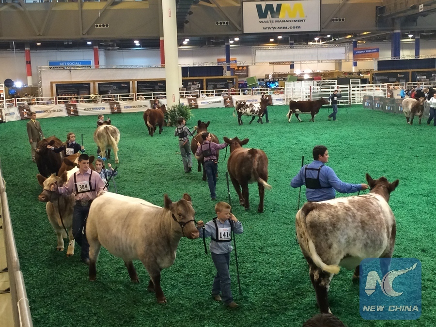 People walk around an arena with their cows before competitions during the 2016 HoustonLivestock Show and Rodeo in Houston, the United States, March 11, 2016. The Houston Livestock Show and Rodeo is held from March 1 to March 20 at the NRG Park in Houston. (Xinhua/Zhang Yongxing)