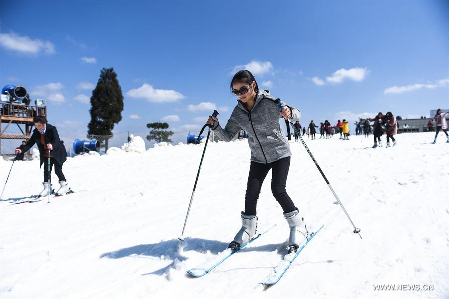 Citizens ski at the ski resort of Yushe Snow Mountain in Shuicheng County, southwest China's Guizhou Province, March 8, 2018. Ski resort of Yushe Snow Mountain is opened free to female tourists all day to celebrate the International Women's Day on Thursday. (Xinhua/Tao Liang)