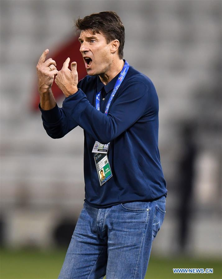 Al-Rayyan's head coach Michael Laudrup reacts during the AFC Champions League Group D soccer match between Qatar's Al-Rayyan and Saudi Arabia's Al-Hilal FC at Jassim Bin Hamad Stadium in Doha, capital of Qatar, March 12, 2018. Qatar's Al-Rayyan won 2-1. (Xinhua/Nikku)