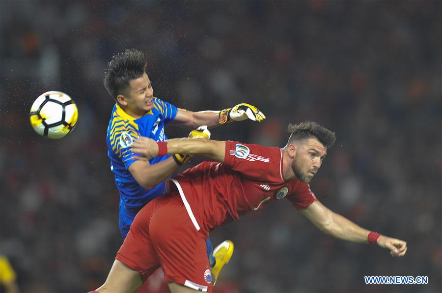 Marko Simic (R) of Persija Jakarta of Indonesia vies with Le Quang Dai, goalkeeper of Song Lam Nghe An of Vietnam during the AFC Cup 2018 Group H qualification match in Jakarta, Indonesia, March 14, 2018. Persija won 1-0. (Xinhua/Zulkarnain)