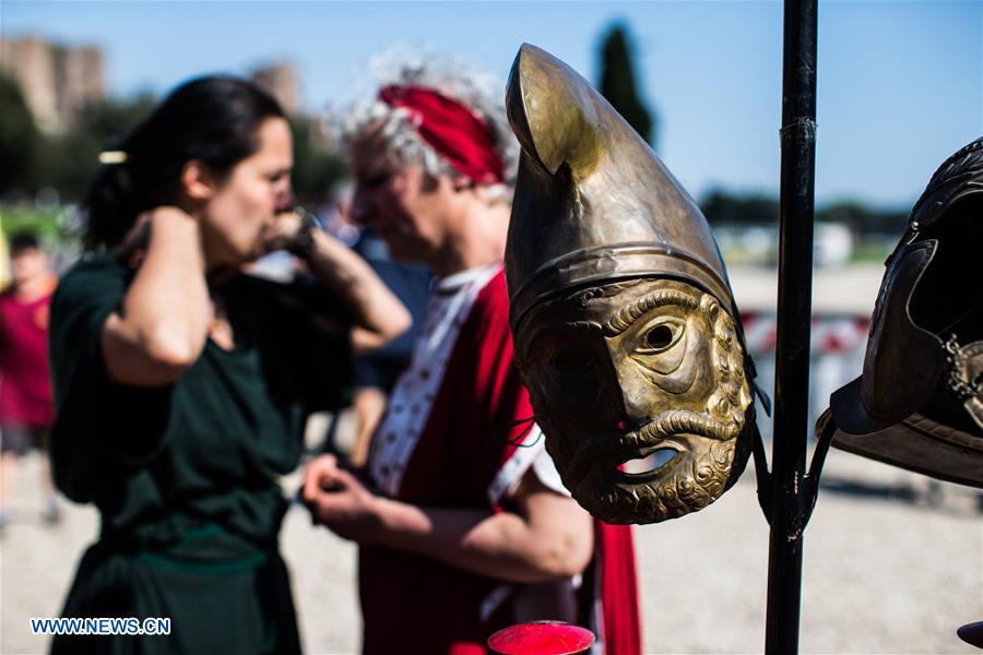 People sell products in ancient Rome's style at the Circus Maximus in Rome, capital of Italy, April 21, 2018. Celebrations took place across Rome on Saturday as the capital of Italy commemorated its founding 2,771 years ago. (Xinhua/Jin Yu)