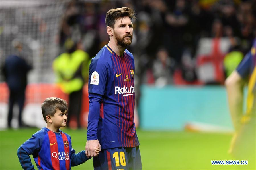 FC Barcelona's Lionel Messi accompanies his son after the Spanish King's Cup final match between FC Barcelona and Sevilla in Madrid, Spain, on April 21, 2018. FC Barcelona claimed the title by defeating Sevilla with 5-0. (Xinhua/Guo Qiuda)