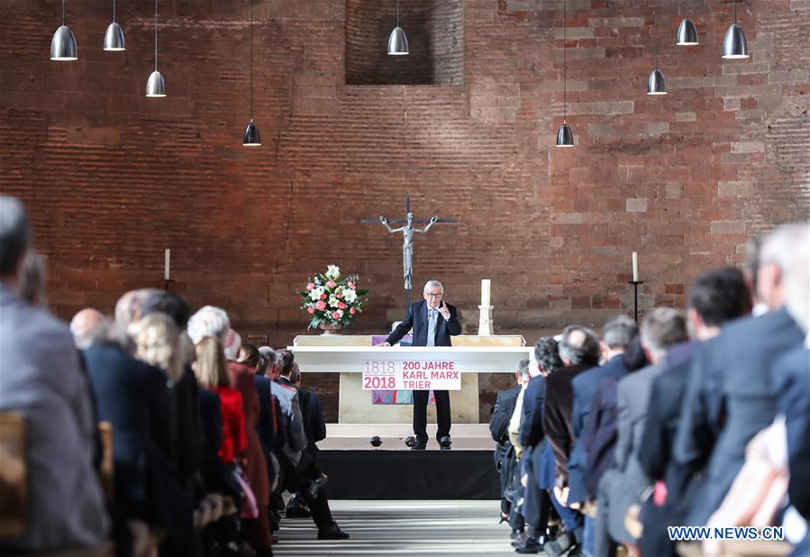 European Commission President Jean-Claude Juncker delivers a speech during the opening ceremony of the Karl Marx exhibition, at the Basilica of Constantine in Trier, Germany, on May 4, 2018. European Commission President Jean-Claude Juncker said Friday that Karl Marx was a forward-looking philosopher and his works changed the world, as Marx's hometown Trier is marking the thinker's 200th birthday. (Xinhua/Shan Yuqi)