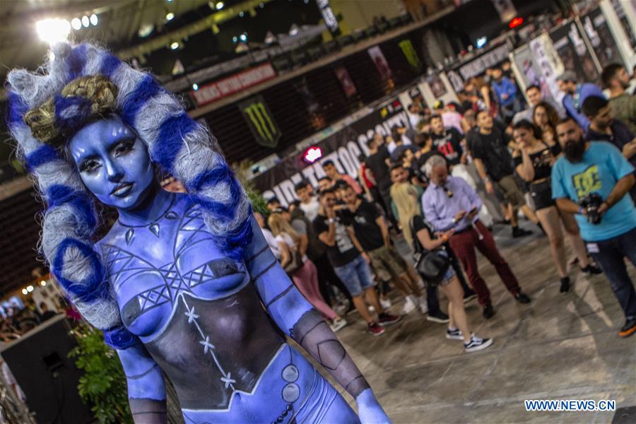 Photo taken on May 13, 2018 shows a body painting stage show during the 12th International Athens Tattoo Convention in Athens, Greece. Thousands of tattoo enthusiasts visited the convention here during the weekend. (Xinhua/Chris Kissadjekian)