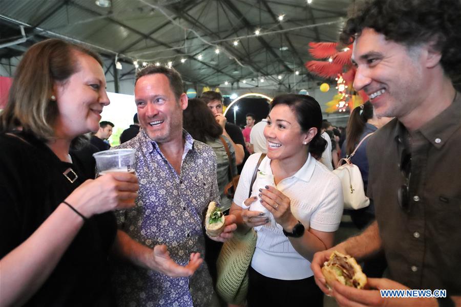 Visitors chat with each other during the 3rd annual Street Food Festival in Athens, Greece, on May 18, 2018. (Xinhua/Chris Kissadjekian)