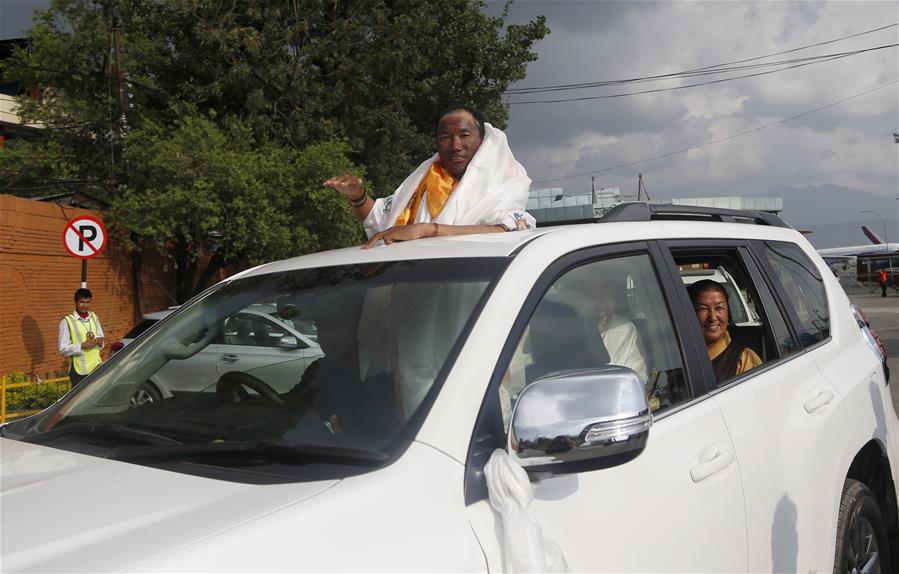 Kami Rita Sherpa arrives at Tribhuvan International Airport in Kathmandu, Nepal, on May 20, 2018. Nepal's Kami Rita Sherpa on Wednesday scaled the world's highest peak Qomolangma for the 22nd time with a record of highest number of summits, government officials confirmed. (Xinhua/Sulav Shrestha)