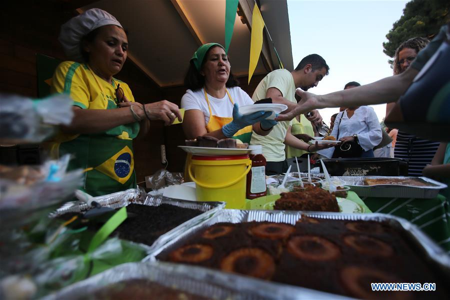 Women from Brazil serves traditional Brazilian food during the two-day Latin American Festival in front of Zappeion, Athens, Greece, on June 2, 2018. (Xinhua/Marios Lolos)