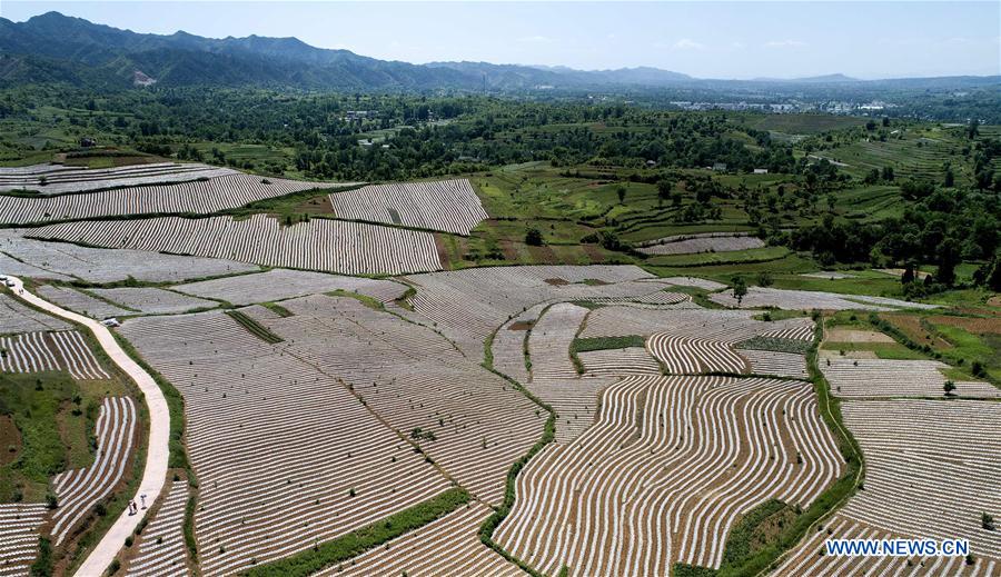 People visit a red cluster pepper plantation in Zhouling Village of Luonan County, northwest China's Shaanxi Province, June 5, 2018. The county developed the industry of red cluster pepper planting to promote poverty alleviation. (Xinhua/Tao Ming)