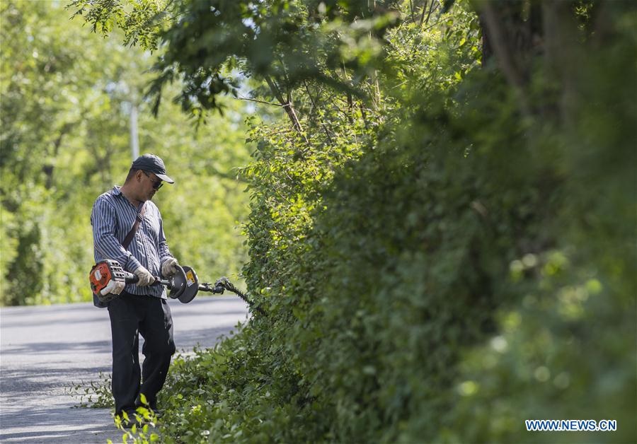 A staff member trims the green belt of the Yamalik mountains in Urumqi, capital of northwest China's Xinjiang Uygur Autonomous Region, June 7, 2018. Decades of afforestation efforts by the government has turned the barren hill Yamalik mountains into a green paradise to curb sandstorms by planting trees. Once the biggest barren hill in Urumqi and a source of sandstorm that menace the city, Yamalik mountains have been planted with more than 1.18 million trees over the past 20 years, with the current forest coverage of 2,200 hectares. (Xinhua/Hu Huhu)