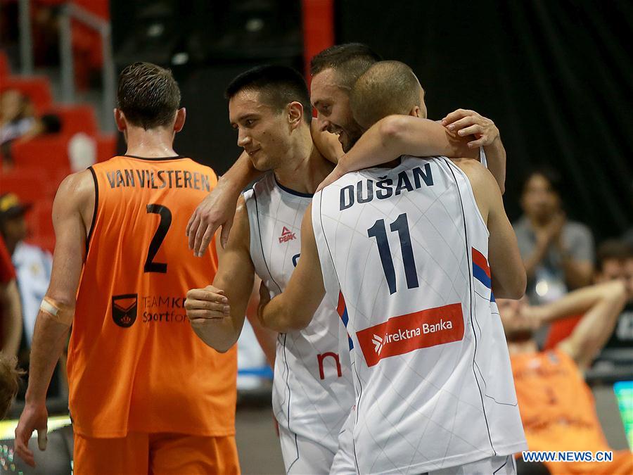 Players from Serbia celebrate after winning the gold medal against the Netherlands during the men's gold medal match at the FIBA 3x3 World Cup in Bulacan Province, the Philippines, June 12, 2018. Serbia won 16-13. (Xinhua/Rouelle Umali)