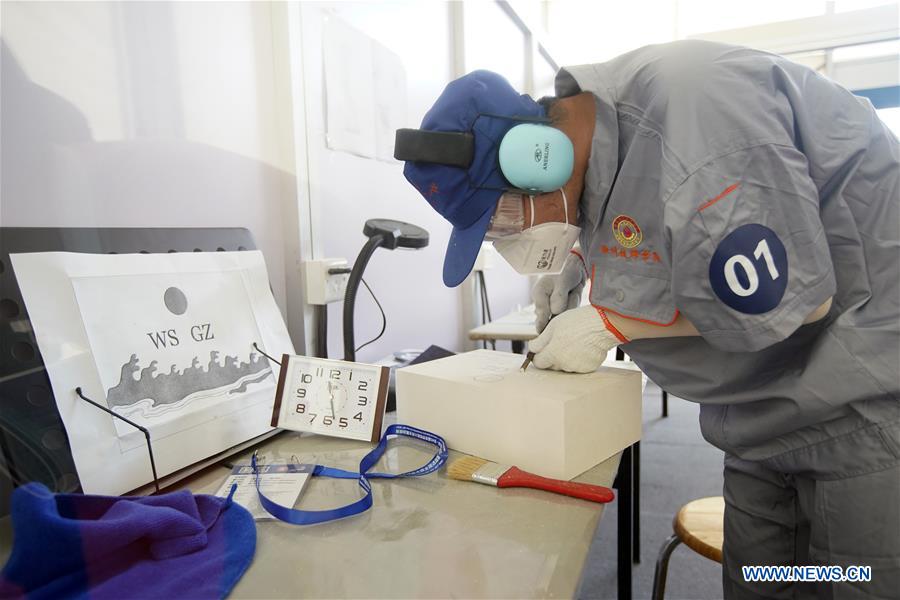 A contestant carves a stone during a trial of the 2018 ChinaSkills Competition in Guangzhou, capital of south China's Guangdong Province, June 25, 2018. A series of trial events in the 2018 ChinaSkills Competition kicked off in Guangzhou on Monday. By holding trial events in Guangzhou and Shanghai respectively, the 2018 ChinaSkills Competition will select qualified candidates to make up team China for the WorldSkills Kazan 2019.(Xinhua/Shen Bohan)
