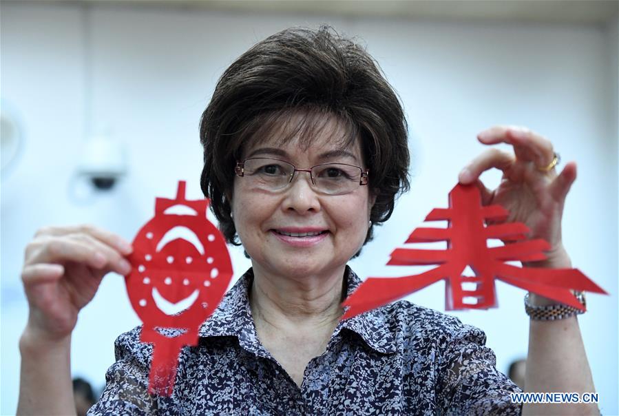 A woman from Thailand shows her paper-cutting work at the Guangxi University in Nanning, south China's Guangxi Zhuang Autonomous Region, June 25, 2018. A delegation from Thailand experienced activities of Chinese traditional culture including paper-cutting, calligraphy, Chinese class, etc. at the Guangxi University. (Xinhua/Lu Boan)
