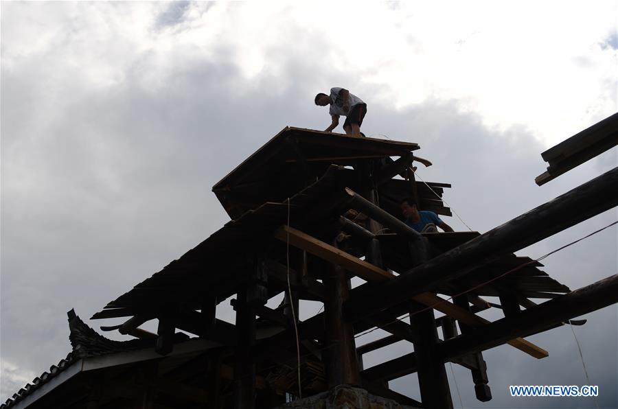 A worker works at the construction site of the Shuanglonggou Forest Tourist Resort in Miao Autonomous County of Rongshui, south China's Guangxi Zhuang Autonomous Region, June 26, 2018. Local government tried to get residents out of poverty by developing tourism industry. (Xinhua/Lu Boan)?