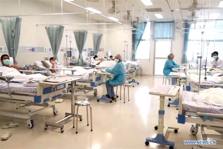 Boys rescued from the Thai cave wear masks and rest at a hospital in Mae Sai, Chiang Rai province, northern Thailand, in a still image taken from a July 11, 2018 handout video. According to reports, all 12 boys of a child soccer team and their assistant coach have been rescued and evacuated to a hospital.(Xinhua)