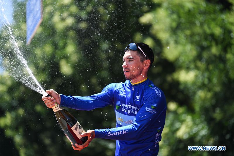 Arman Kamyshev from Kazakhstan Vino-Astana Motors (VAM) celebrates with the blue jersey for best Asian cyclist, at the award ceremony of the third stage of the Tour of Qinghai Lake in northwest China's Qinghai Province, on July 24, 2018. (Xinhuanet Photo by Yang Shoude)