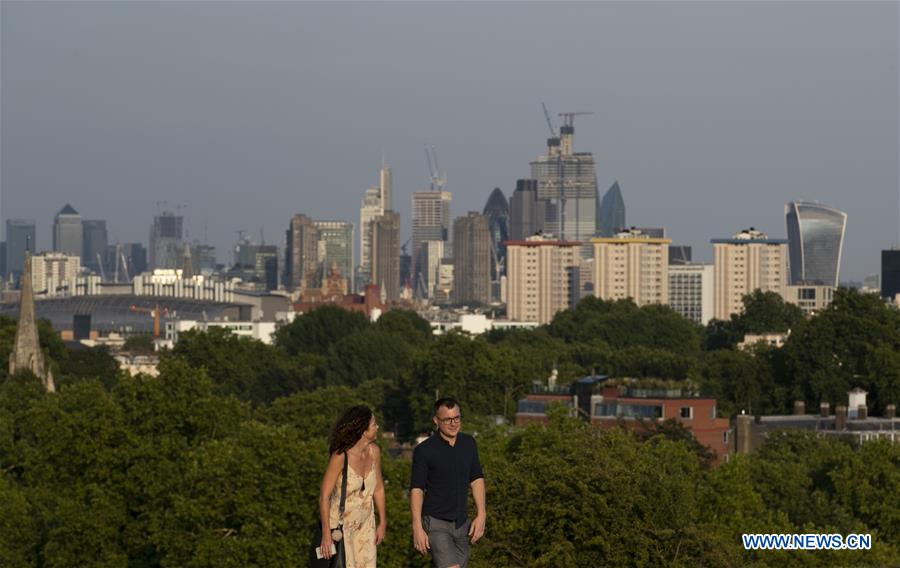 People walk in a park in London, Britain on July 26, 2018. Temperatures in the coming days could break all-time UK records, with the mercury set to soar to 37 degree Celsius, it is forecasted Thursday. (Xinhua/Han Yan)