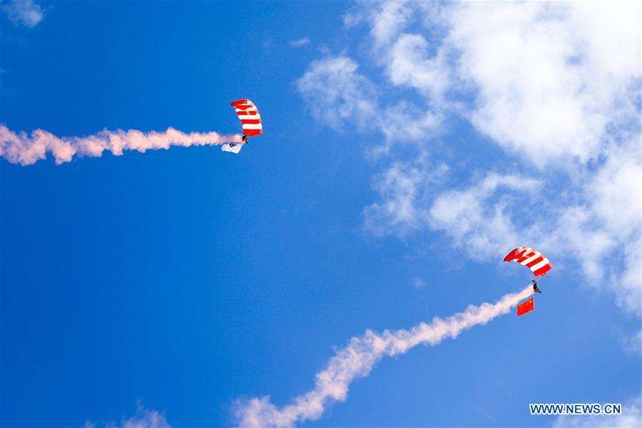 A parachuting show is held during the opening ceremony of the International Army Games 2018 in Korla, northwest China's Xinjiang Uygur Autonomous Region, July 29, 2018. Four contests of the International Army Games 2018 kicked off Sunday in northwest China's Xinjiang Uygur Autonomous Region and southeast China's Fujian Province. (Xinhua/Yin Along)